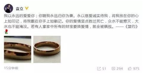 袁立正式宣布結婚后在微博曬出與老公梁太平的婚戒,戒指內部分別刻有兩人的名字,她還甜蜜配文:“我以永遠的愛愛你;你聘我永遠歸你為妻。永以慈愛誠實待我,將我放在你的心上如印記,將我戴在你手上如戳記。你的愛情堅貞勝過死亡,眾水不能熄滅,大水也不能淹沒。若有人拿家中所有的財寶要換愛情,就全被藐視。——《盟約》”