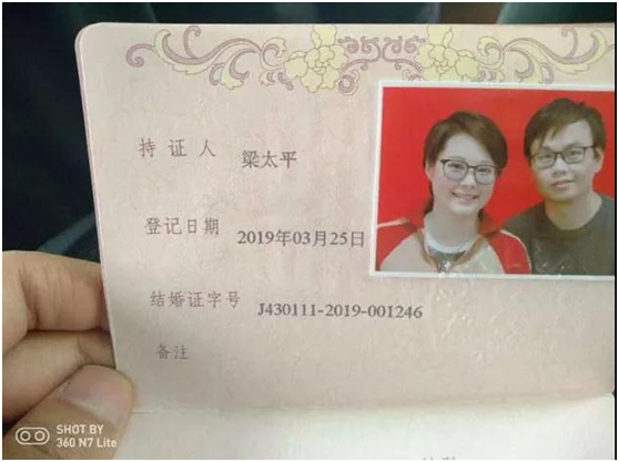 ▲網傳袁立、梁太平結婚證照片