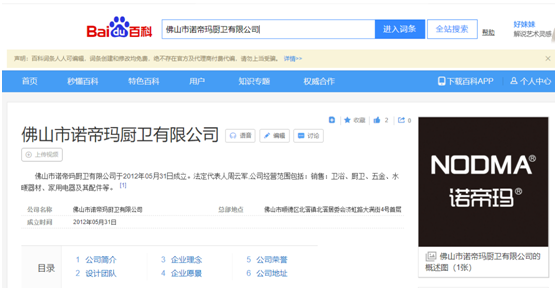 百度百科作為多種網(wǎng)絡平臺的“中心點”,與百度搜索、百度知道結合,從不同的層次上滿足用戶對信息的需求,實現(xiàn)信息最大價值化。正因如此,諾帝瑪將此作為重點“攻破”對象,以簡明扼要的文字建立起企業(yè)的百科詞條,有效提升品牌公信力和權威性。