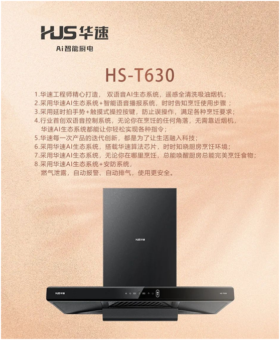 別擔心,“中國十大健康節(jié)能廚衛(wèi)電器品牌”——華速廚衛(wèi),幫你徹底解決廚房油煙問題。和其他油煙機不同的是,華速雙語音AI生態(tài)系統(tǒng),遙感全清洗吸油煙機——HS-T630將煙機吸風(fēng)口下潛至距灶臺350MM黃金控煙區(qū),同時在頂部機身增加了輔助進風(fēng)口,并通過雙風(fēng)口環(huán)吸技術(shù),把油煙直接從油煙產(chǎn)生處吸走,達到靠得越近吸得越凈的效果,真正實現(xiàn)油煙不上臉,讓烹飪者徹底遠離油煙困擾。此外,其還具有以下5大特點: