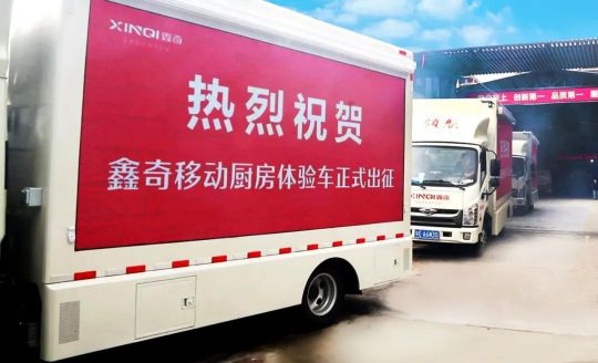 “省氣30%的高效猛火灶來了,能實現99%油煙分離率的油煙凈化機來了,省空間、更實用的廚房集成機來了,高端耐用的不銹鋼櫥柜來了,鑫奇移動廚房體驗車,帶著超國標專利集成廚電開啟‘工廠進小區惠民行動’啦”。