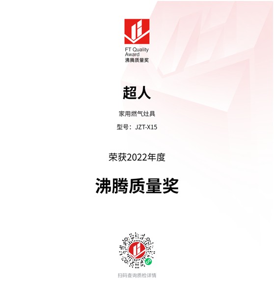 “沸騰質量獎”是針對家居產品質量性能進行測評的大獎,以高規格的測評依據、承檢機構、檢測設備、流程管控和顧問把關,秉持客觀、嚴謹、公正的態度和“精工品質 用數據說話”的宗旨獲得廣泛認可。據悉,經過承檢機構國家燃氣用具產品質量檢驗檢測中心(佛山),對超人參評的家用燃氣灶具(JZT-X15)節能性能、健康環保性能和安全性能中的7項指標進行嚴格檢測,結果達到測評標準要求,并且多項性能指標優于標準要求,獲得“沸騰質量獎”。