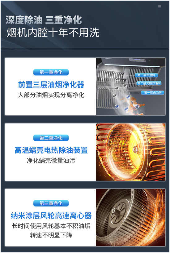在硬核方面,樂鈴吸油煙機采用三重凈化技術。第一重凈化,前置三層專利油煙凈化器;第二重凈化,高溫蝸殼電熱除油裝置;第三重凈化,納米涂層風輪高速離心器,煙機內(nèi)腔十年不用洗。