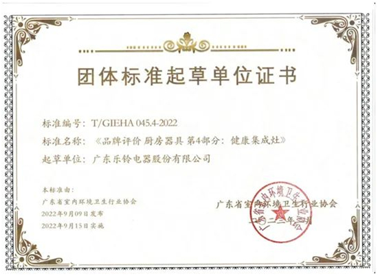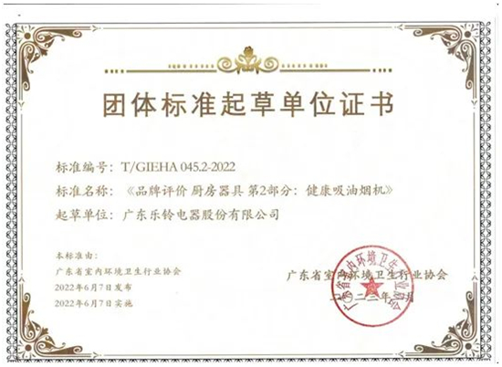 樂鈴憑借著在廚房電器領域內吸油煙機和集成灶對廚房油煙難關的攻克,參與《健康吸油煙機》、《健康集成灶》等團體標準的制定,推動行業的健康升級,守護億萬家庭的呼吸健康。
