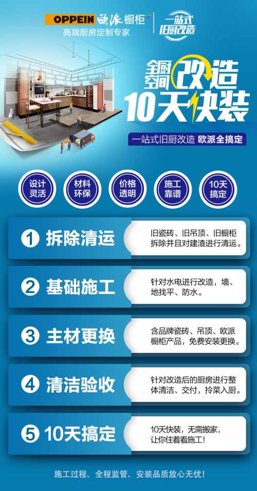 歐派廚房櫥柜“一站式舊廚更新改造”服務,只需用十天就能完成水電、廚房櫥柜、瓷磚、吊頂和施工等全部事情。并且歐派是知名品牌,品質有保障,全部材料都通過精心挑選,價格透明,沒有隱形消費。全部更新改造流程再有專人監工,十天快裝無需搬家,讓親人住著看施工,完全無需自個操心。