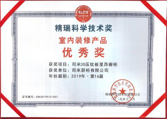 值得一提的是,2019年12月9日,司米櫥柜更憑著“3D壓紋板里昂廚房櫥柜”獲評精瑞科學技術獎之“室內(nèi)裝修產(chǎn)品優(yōu)秀獎”,從289項申報新項目中歷經(jīng)逐層審核與評定,獲得成功,變成第16屆精瑞人居獎中僅有一家取得部品類新項目獎的家居定制企業(yè)。