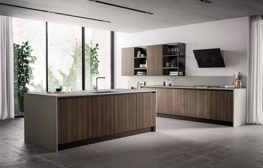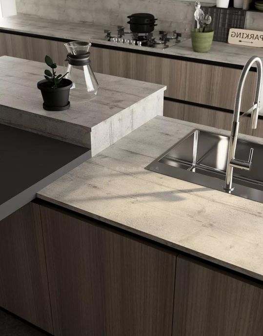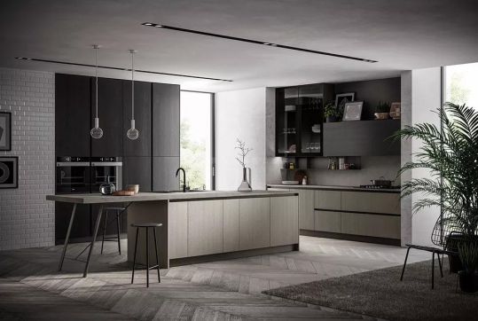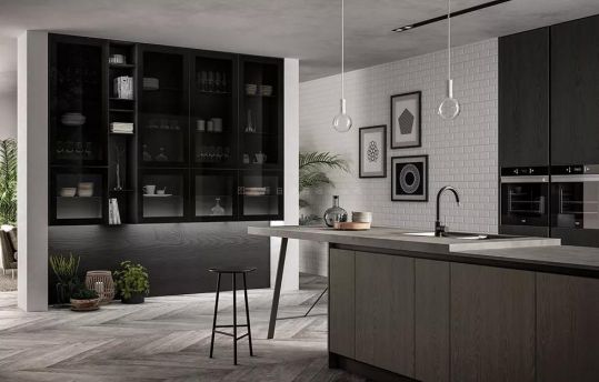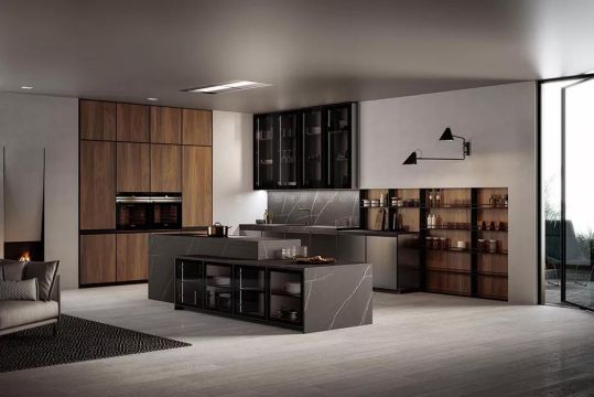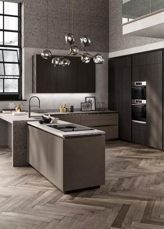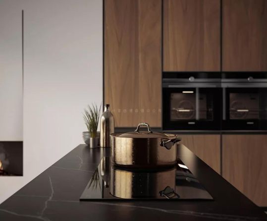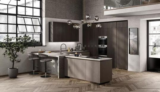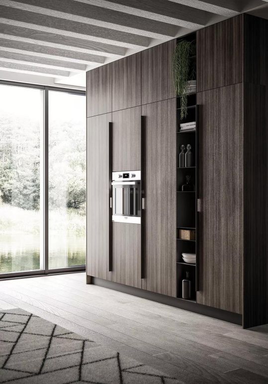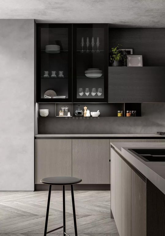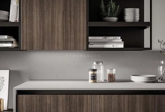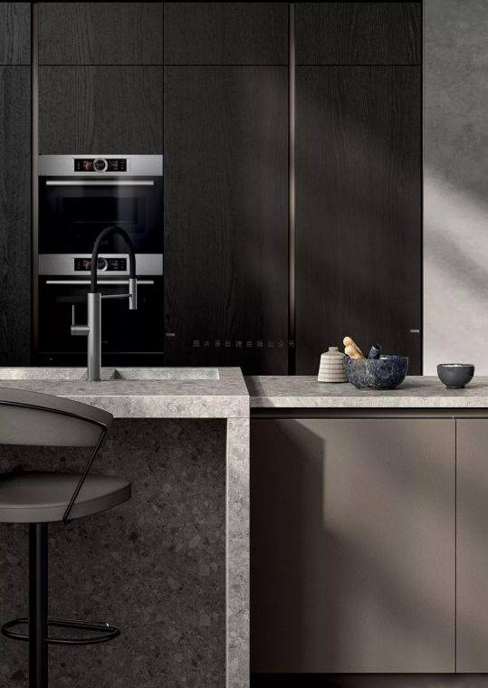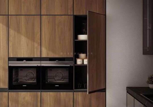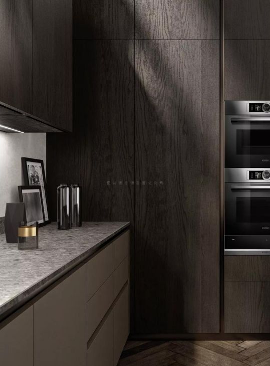 深色系木紋一直是高雅生活的時尚風范,它沒有特定的風格,卻能駕馭任何一種風格,對于在廚房櫥柜上的應用,恰好能更好的展現出線條的利落感與平行之美,深色調的基礎再糅合些許中性色,幻化出柔和、飽滿的調和之美。