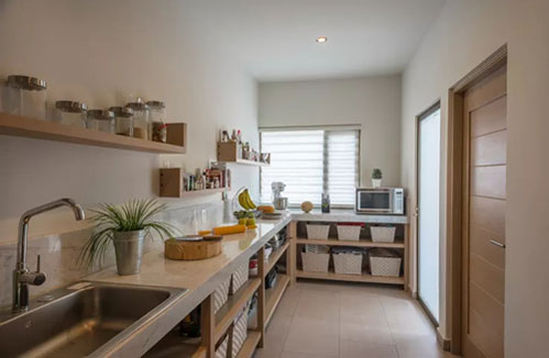 這里的收納是開放式的,應該說是半開放式,在開放的層架裡擺上分門別類用的籃子,再簡單不過了。記得選用干凈、統一的籃子,市面上各種尺寸也很多,價錢不貴,還隨時能更換。而且,越小的廚房,這種設計會越好看,甚至有延伸視覺的功能,是不是很奇妙呢!