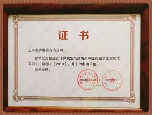 濕騰電器,被鑒于在溫濕度控制領域的獨角獸地位,以及快速在國內空氣源熱泵兩聯(lián)供市場樹立起來的標準化標桿形象,良好的市場信譽與突出的系統(tǒng)節(jié)能貢獻,受邀參加了這兩次會議,并在1月8日該“導則”初稿討論會上,獲頒“參編單位”證書。