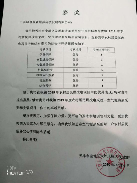 函中提到,近日,大鐘莊鎮人民政府組織的大鐘莊鎮農村居民煤改電項目考核組對該鎮2019年農村居民煤改電情況進行了考核。考核項目分別為供貨保障、安裝進度保障、安裝質量保障、村鎮配合度、機組運行效果、售后服務、綜合考核七項。在考核中,紐恩泰不僅在每個項目中都獲得了“優秀”的好評,還拿下了所有項目的第一名,成為該鎮2019年煤改電當之無愧的“狀元”品牌。因此,大鐘莊鎮人民政府特發此函,以感謝紐恩泰對該鎮2019年農村居民煤改電采暖作出的卓越貢獻。