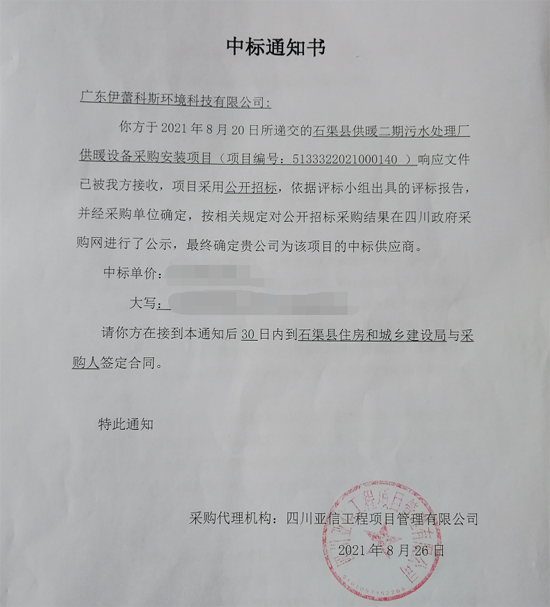 日前,四川石渠縣污水處理廠二期供暖設備安裝采購項目中標結果在四川省政府采購網進行了公示,伊蕾科斯空氣能成功中 標,成為該項目的服務商。