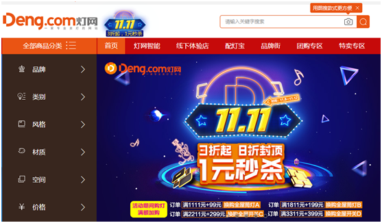 據(jù)調(diào)查,目前大多數(shù)中國(guó)家庭的燈飾消費(fèi)約占裝修費(fèi)用的10%,結(jié)合“互聯(lián)網(wǎng)+”創(chuàng)新氛圍的大力推動(dòng),可見現(xiàn)階段燈具電商行業(yè)正處于良好的市場(chǎng)大環(huán)境。Deng.com燈網(wǎng),這家專業(yè)賣燈的電商平臺(tái),正是在此環(huán)境下獲得迅速成長(zhǎng),在去年(2018年)持續(xù)3天的“雙11”活動(dòng)中,創(chuàng)下了全新記錄——累計(jì)超出1.05億的成交額。