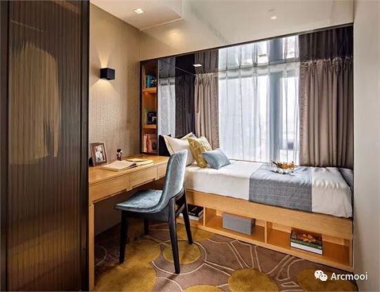 與主次臥不同的是,兒童房沒有額外裝吊頂。因為考慮兒童還有看書寫字的需求,所以光線相對主次臥更明亮。在書桌上方加了一個上下發(fā)光的壁燈,即達到健康照明的需求,又為房間增添了一個小裝飾。