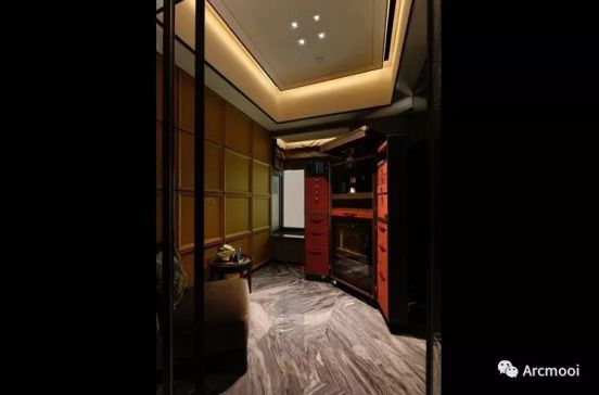 The vermilion shoe cabinet seemed very striking under the soft light, and formed the strong comparison with the cool tone marble, so we can easy to find that owner is a not only quiet but also enthusiasm person. The warm light LED strip from the ceiling blind slot, there make owner feel real relax and peaceful. And you can see the spot light above the shoe cabinet as accent lighting, to enhance the brilliance, where can make owner find and take something conveniently.