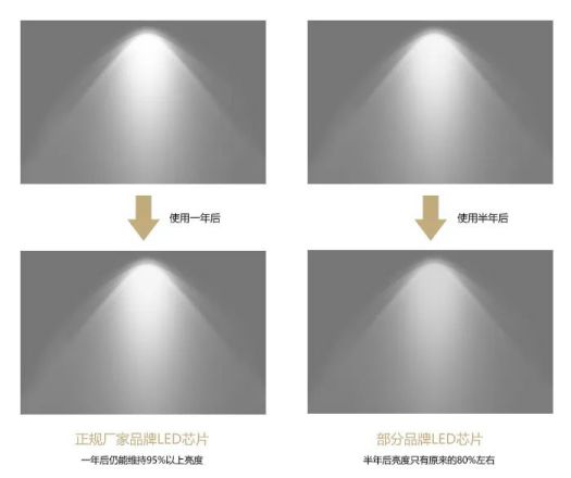 光衰:LED經(jīng)過(guò)一段時(shí)間的點(diǎn)亮后,其光強(qiáng)會(huì)比原來(lái)的光強(qiáng)要低,而低了的部分就是光衰,光衰越低,燈具的可持續(xù)使用性越好。