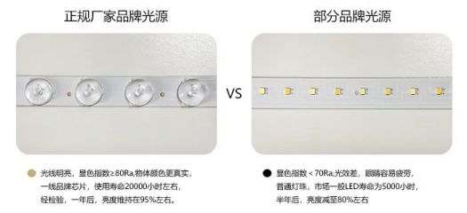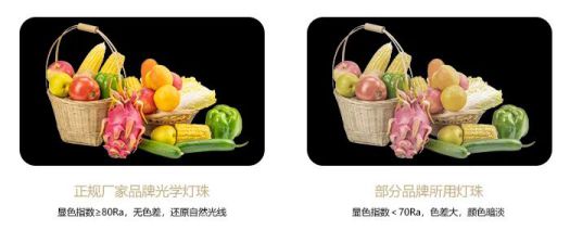 市面上部分燈飾產(chǎn)品選用燈珠顯色指數(shù)少于70 Ra ,存在明顯的色偏問(wèn)題,而正規(guī)廠家選用的是一線品牌專(zhuān)業(yè)光學(xué)燈珠,顯色指數(shù)≥80Ra,高度還原物品本身的色彩,自然光線減輕雙眼負(fù)擔(dān),避免眼疲勞。