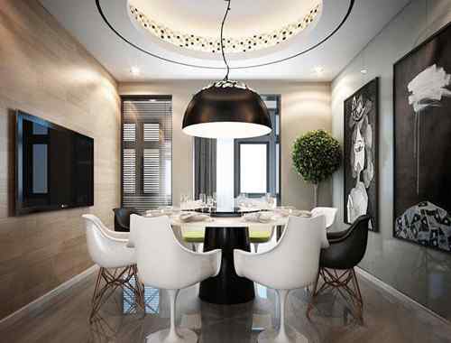 圓形的吊頂,圓形的吊燈,圓形的餐桌,圓潤的造型搭配,從立體上形成了呼應,給人有一種很圓潤的感覺。