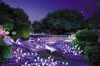 十月的古鎮,彩燈飾點。作為燈光節的主打作品,“生態之殤”、“童話世界”、“珍藏的記憶”等,從“光·生命之源”這一主題出發,打造了一個個引人無限遐思的燈光場景。譬如,“生態之殤”中滿樹懸掛“繁星”,而地上卻擺放了巨型魚骨等造型的燈光作品,意在呼吁人們要從身邊的一點一滴做起、關愛地球。