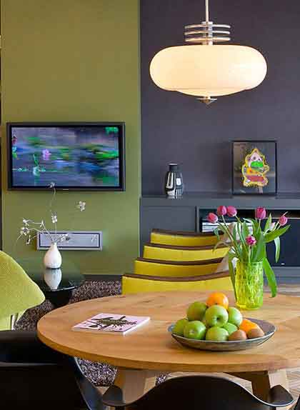 如果墻面選擇了單色,不用擔(dān)心,只要后期軟裝稍作處理,一樣可以搭配出色彩繽紛的活力之居。明亮的黃色單椅搭配拼圖地毯,繽紛的色彩呼之欲出。黃色跟綠色墻體搭配更覺空間出彩。