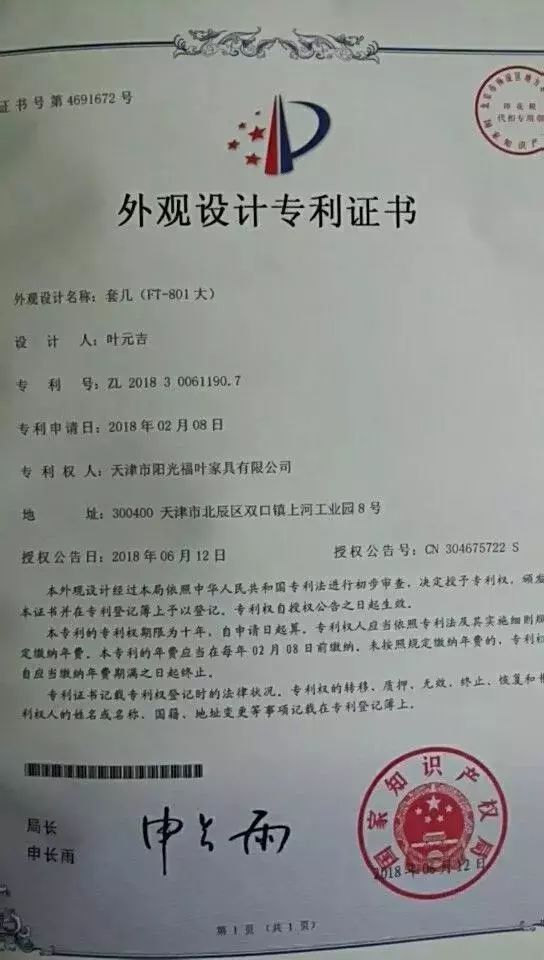 在產品開發上,福葉投入了十分大的精力,申請了所有的產品的外觀設計專利證書,著力打造更具有特點的產品。此外「福葉·檀府」的商標也受法律保護。將來福葉還將申請越來越多的專利,為福葉家居的品牌推廣確立牢靠的基礎。