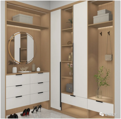 中間的開放格可以存放自己喜愛的包包、飾品等,也可以放上自己喜歡的藝術(shù)品,為整個(gè)空間增添更多的藝術(shù)氣息。