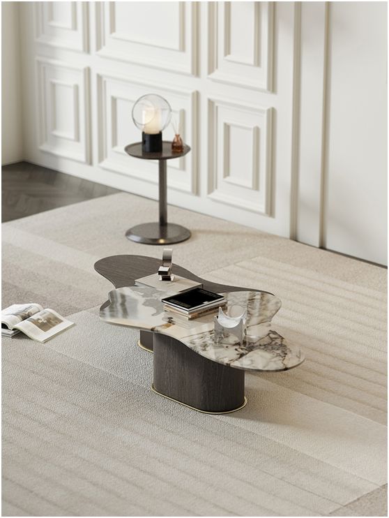 一半是木質,一半是大理石;一半溫潤淳樸,一半典雅華貴;兩種截然不同的氣質竟意外融洽,兼具兩種不同材質的美感,極富創意又充滿奢華質感。參差的高度打破了傳統大茶幾的沉悶呆板,客廳空間瞬間變得生動而活潑。亮色金屬勾勒茶幾底座,瞬間提高整體的明亮、優雅。每一個細節都藏著細致貼心的設計構思,美感與實用性兼備。