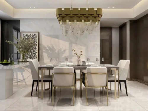 爵士白大理石裝飾墻面延續了客廳的基調,金屬與木質結合的平直線條餐桌與餐椅,現代感十足。金色吊燈的選擇讓輕奢質感歸于生活。吧臺黑白抽象裝飾畫與旋轉吧椅的搭配,為整體空間得到視覺延伸效果。