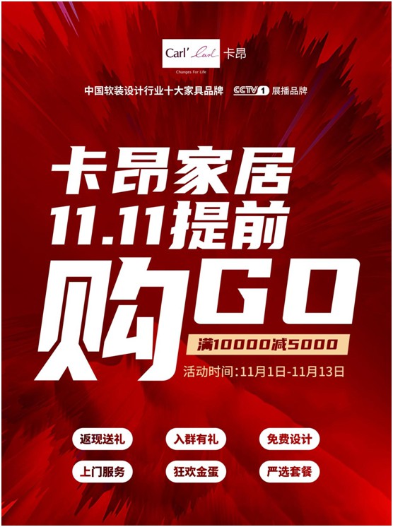 10月31日晚8點,隨著京東、天貓開啟尾款支付,雙十一購物狂歡節正式打響!為回饋廣大忠實客戶,卡昂家居于11月1日-11月13日重磅開啟“11.11提前購go,滿10000減5000”的大促狂歡活動,豐富的優惠政策、高顏高質的產品矩陣、海量家居福利,為消費者打造一場別具一格的家居鉅惠盛典!
