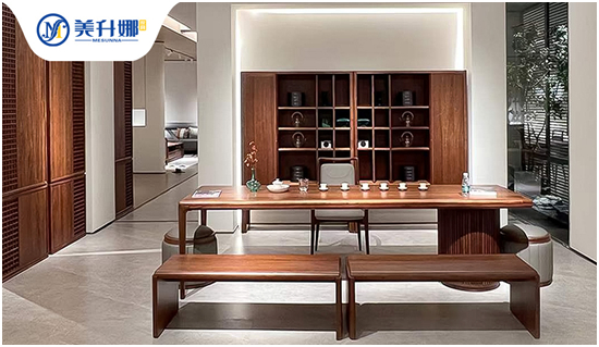 2024年,美升娜家居推出全新系列“北美黑胡桃”全屋整裝和成品家具,覆蓋客廳、餐廳、臥室、衣帽間、書房、茶室、廚房等居室,展現奢華高貴的家居環境,讓家像一幅流動的畫卷,美麗而富有故事。