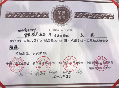 華廈·大不同《畫案》榮獲“2018中國(杭州)紅木家具精品博覽會精品”榮譽證書