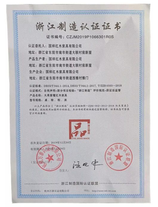 “品字標(biāo)”是頂級浙貨的獨有標(biāo)志,有資質(zhì)在自己產(chǎn)品上貼“品字標(biāo)”的企業(yè),能夠 稱之為是浙江制造業(yè)的“標(biāo)桿”和“領(lǐng)導(dǎo)者”,象征所屬行業(yè)的最高品質(zhì)水準(zhǔn)。近期,國祥紅木家具有限公司(以下簡稱國祥紅木)獲評通過“浙江制造品字標(biāo)”認(rèn)證,是東陽紅木家具行業(yè)中少有的評為企業(yè)之一,可見國祥紅木家具產(chǎn)品品質(zhì)扎實,備受贊譽。
