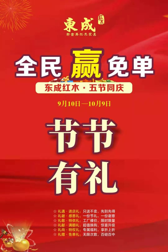 2019年10月9日前,東成紅木“五節同慶節節有禮”活動仍在繼續開展,六重禮遇,免單大獎,使你與高質量紅木家具更近一步。