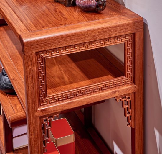 茶臺(tái)整體不采用一釘子一鐵,純榫卯的設(shè)計(jì),使得茶臺(tái)在實(shí)際使用中堅(jiān)固無比。同時(shí)更好地保護(hù)紅木的木質(zhì)結(jié)構(gòu)。