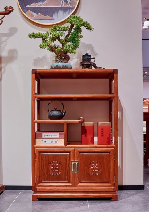 新中式茶水柜設(shè)計(jì)感十足,茶水柜兩側(cè)雕刻回形紋,以及鏤空設(shè)計(jì),遠(yuǎn)看樸素,近觀卻設(shè)計(jì)感滿滿。
