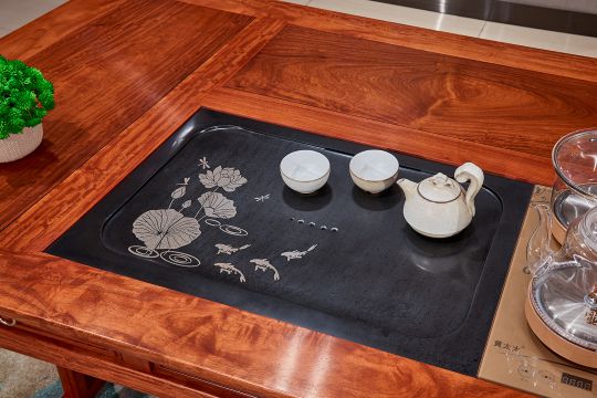 茶臺(tái)設(shè)計(jì)為濕泡臺(tái),茶盤處使用烏金石面板,不生異味、不易沾茶垢,同時(shí)也對(duì)茶臺(tái)起到點(diǎn)綴的作用。