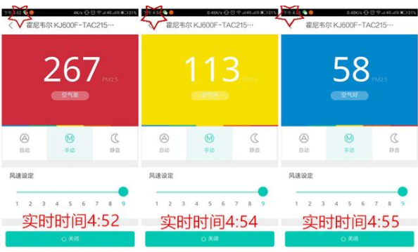 為了測試這臺霍尼韋爾空氣凈化器的功能,我不惜點燃了一盒“滅蚊片”做測試!相信很多人都見識過滅蚊片!一旦點燃,即刻變有刺鼻的濃煙蔓延整個房間!可奇妙的是:滾滾的濃煙和刺鼻的氣味,仿佛還沒來得及讓我看清、聞到,就已經被凈化器吸收、過濾了!凈化器感應之靈敏,令我咋舌!點燃滅蚊片后短短一分鐘時間,凈化器就爆亮起“紅燈”!PM2.5數顯高達365!煙霧并未來得及發散便被凈化器強力吸入,可見吸力之大;吸入的煙霧絲毫也沒有在上部出風口排除,可見凈化效果之強。