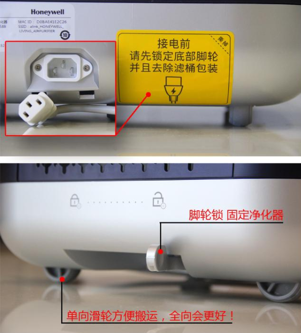 霍尼韋爾的小設計也是非常貼心和感人的。機器后蓋采用“磁石吸附”的設計,濾網鎖緊把手就位后,后蓋底部卡入小孔,輕輕往上一合,六塊磁石自然牢牢吸附,后蓋的安裝就完成了。非常省力。非常人性化的警告提示,防止在機器使用前誤操作。我剛拿到機器時根據常識去除了濾芯的保護膜,然后翻來覆去的找電源線接口,很巧妙的隱藏在黃色警示標貼后面。AT--X3還采用了腳輪鎖止設計,腳輪鎖打開時,可以直線方向很輕松地移動空氣凈化器,更換擺放位置;腳輪鎖就像汽車的手剎,鎖住時能防止工作期間滑動,也可避免孩子誤撞到空氣凈化器導致機器滑行。
