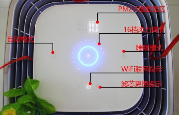 操控面板設計在凈化器的頂部,觸控時毫不費力。觸摸控制,手指輕輕劃過,顯示燈便亮起,靈敏、唯美、優雅。各指示圖標功能明確,操作簡單,一目了然。它分為自動、手動和睡眠模式,自動模式時,凈化器會根據空氣質量指數來調節能效和風量。睡眠模式開啟時,靜音無聲,連指示燈都會熄滅。風力調節有16檔,風力指示小燈點沿著中央開關鍵呈圓形分布,十分漂亮。