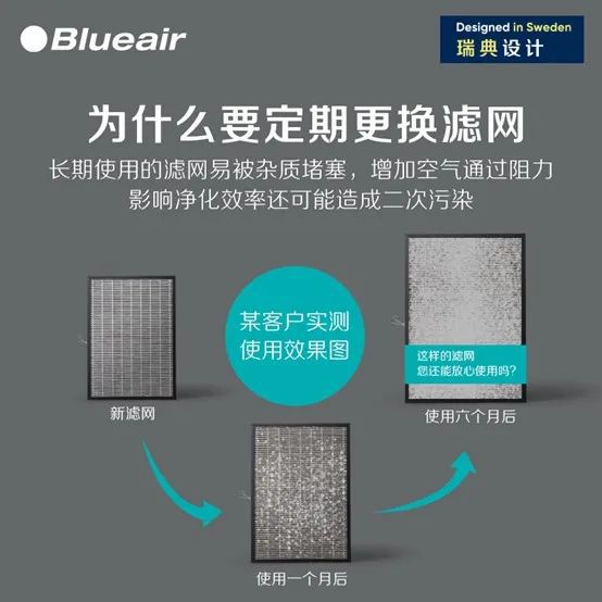 剛剛?cè)胧挚諆舻摹懊刃隆笨赡軙?huì)產(chǎn)生這樣的疑惑?濾網(wǎng)具體多久換一次呢?一般每天24小時(shí)開啟凈化器的情況下,濾網(wǎng)最好半年更換一次,遇到極端特殊情況,比如換季期、霧霾極其嚴(yán)重秋冬季,根據(jù)使用情況,這段時(shí)間結(jié)束后就可以考慮更換濾網(wǎng)。大家一定要記住,濾網(wǎng)定期更換才能保證空凈系統(tǒng)的效果哦!為了保障空凈效果的最優(yōu),Blueair建議你濾網(wǎng)應(yīng)每6個(gè)月進(jìn)行更換*。