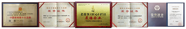 憑借以上五大優勢,偉正公司經過20年的艱苦奮斗,獲得了無數榮譽,包括被中國木業網及十大品牌網等權威網站多次評選為中國板材十大品牌、生態板十大品牌、細木工板十大品牌等榮譽稱號。同時先后被中國工商局及中國質量技術監督局評為廣東省名牌、廣東省著名商標、廣州市著名商標;偉業牌更是進駐了"國家生態建材展"、成為了廣東改革開放三十周年成就展入選品牌。截止到2016年6月5日,"偉業牌"裝飾板材的生產總面積可以覆蓋地球一次。在快速發展過程中,偉業牌也不斷的受到不法份子的侵蝕,為了保護消費者的利益,"偉業牌"防偽技術全面升級,與國際著名防偽公司合作,采用先進防偽技術的同時,在行業中首創"防偽專利"工藝,利用國家發明專利來提高造假門檻,使造假難度大大的提高,確保消費者能買到真正的"偉業牌"產品。