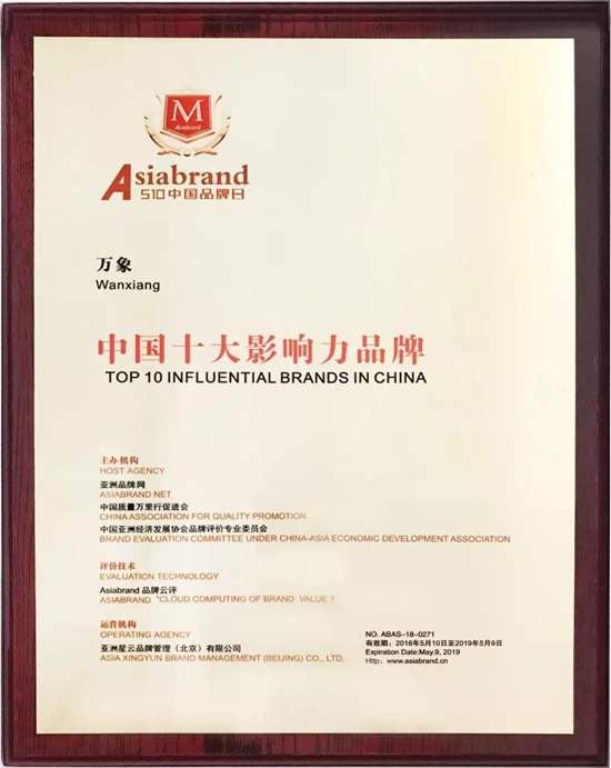 萬象榮獲中國十大影響力品牌