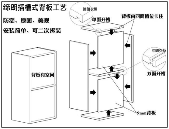 專業廠家采用厚度9mm或更厚的背板,三聚氰胺貼面,采用嵌槽式反革搭接結構,防止背板直接與墻面接觸面吸收墻面上的水分。有些品牌,背板厚度薄,采用釘接式背板連接,背板與墻體直接接觸,墻面上的水份濕氣很容易被板材吸收,容易受潮、發霉、變形,使柜體失去密封性。