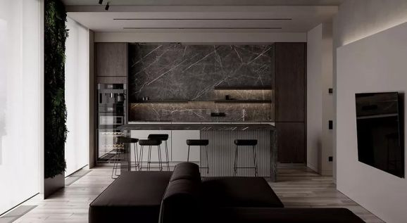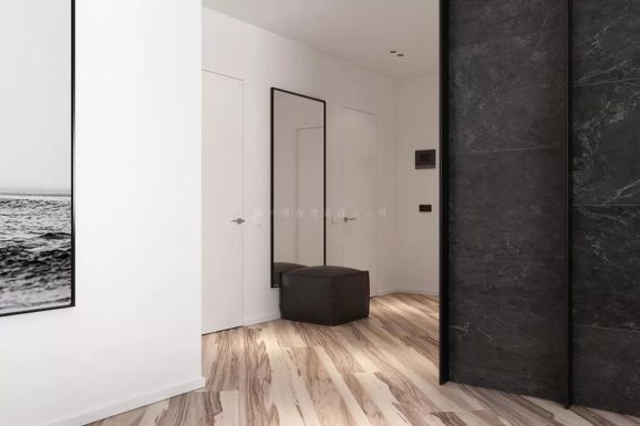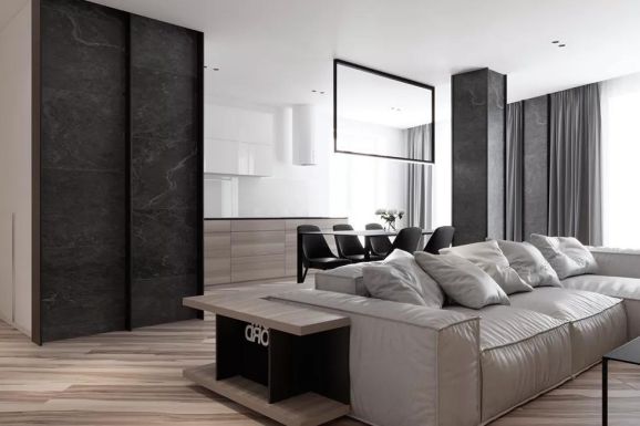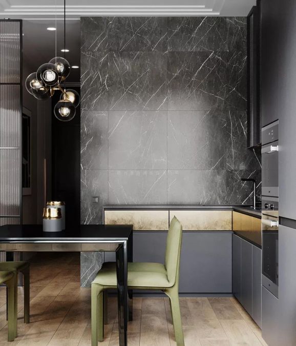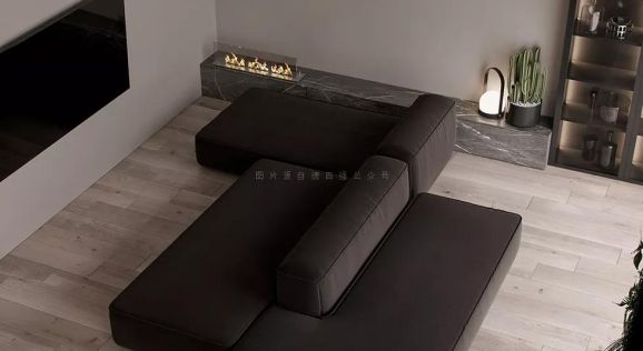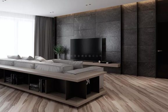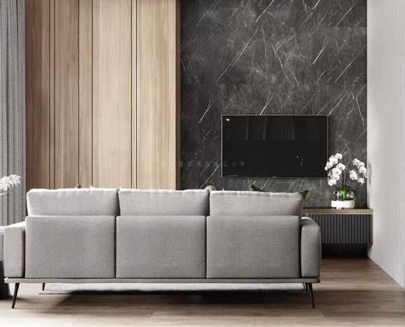 藝術背景墻與巖石板材中點綴以恰到好處的木質元素,塑造簡約輕奢氣質。不論是色彩還是材質都非常簡單。