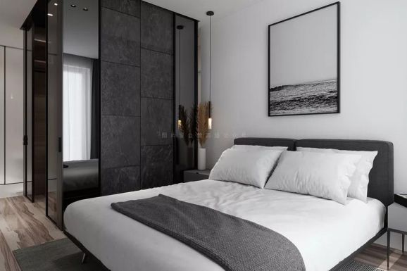 主臥重點突顯家具品質在空間中的重要性,錯落的定制柜是整個空間不安份的元素,特別而優雅,將自然而富有美感的材質與功能性家具結合,秉承簡約低奢風格,風格魅力不謀而合。