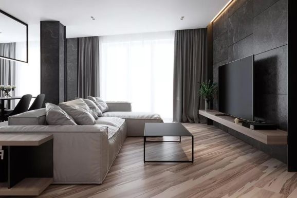 客廳一張灰色沙發,顏色自然的木質地板、巖石板材與定制柜拼接組成的背景墻,當光線透過紗簾,極具層次感的傾灑在客廳內,看起來更加溫暖。