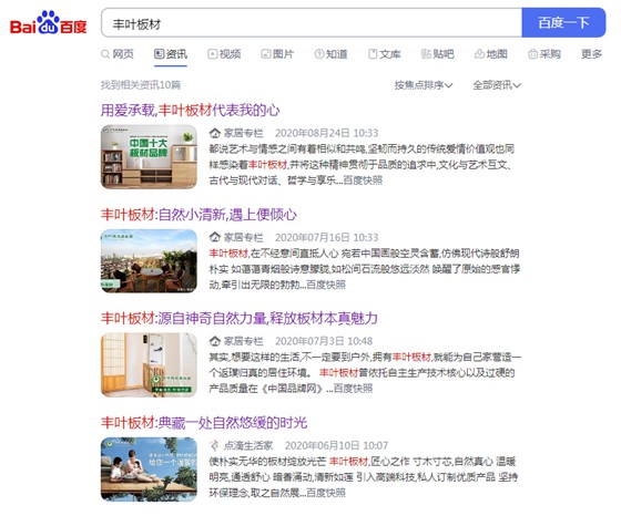 在瀏覽官網后,我們再看看資訊板塊的搜索結果,進一步了解豐葉品牌在新品發布、經銷商會議、客戶案例、參展活動等方面的最新資訊,精準捕捉該品牌的多維度實力。據了解,豐葉板材已與《新浪家居》、《太平洋家居網》、《中華網》、《今日頭條》、《搜狐網》等數百家行業媒體達成戰略合作,將全年為網友更新品牌的實時資訊,讓自身的產品革新及技術升級工作更公開化、透明化。