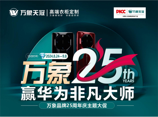 8月24日-9月8日,旺德府家居產業集團重磅推出“萬象25周年,贏華為非凡大師”的主題大促活動,活動期間,全國萬象天冠高端衣柜定制和萬象天冠門店同步上線,“周年特惠”“新品上市”“定制紅利”“董事長直播特惠”“終極大抽獎”等多重優惠來襲,以最實惠的價格、最優質的產品回饋廣大客戶,并有華為非凡大師手機、超級免單大獎、華為平板電腦、科沃斯掃地拖地一體機等您來拿!