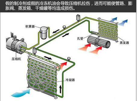 假的制冷劑或假的冷凍機油會導致壓縮機拉傷,進而可能使管路、膨脹閥、蒸發(fā)器、干燥罐等均造成損傷,而這種情況的維修方案很可能就是更換整個空調系統(tǒng)。