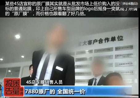 央視記者在浙江杭州進行過調查,一千元購進的膜居然賣到四千元,一些普通車膜傍名牌,使用“XX龍膜、3MXX”等品牌名稱,欺騙消費者。還有劣質品冒充高檔膜,透光率隨意標等,可以說是亂象叢生。