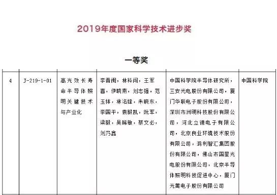 1月10日,由中科院半導體研究所牽頭,三安光電股份有限公司、廈門華聯電子股份有限公司、深圳市洲明科技股份有限公司、河北立德電子有限公司、北京良業環境技術股份有限公司、鴻利智匯集團股份有限公司、佛山市國星光電股份有限公司、北京半導體照明科技促進中心、廈門光莆電子股份有限公司共10家單位聯合完成的“高光效長壽命半導體照明關鍵技術與產業化”科研成果,榮膺2019年度國家科學技術進步獎一等獎。